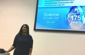 Selvarani Elahi, the Deputy Government Chemist, was invited as a guest speaker at the Annual Open Meeting of the Peninsula section of the Royal Society of Chemistry held at Plymouth University in May 2017.