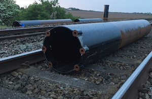 At around 05:15 hrs on 15 May a railway maintenance vehicle, which was moving in an engineering possession, stopped short of a large steel pile on the line. The pile, weighing around 1 tonne, had been left there on completion of earlier engineering works.