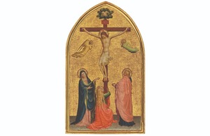 The work by the leading Renaissance artist Fra Angelico depicts Christ on the Cross surrounded by the Virgin Mary, Mary Magdalene, and Saint John the Evangelist. The luminous colours and refined composition are highly characteristic of Fra Angelicos techniques, and the work, dated to the early 1420s, was painted at an important moment in Renaissance art.