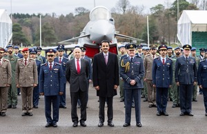 Two Typhoon jets from 12 Squadron the joint UK-Qatar unit intercepted the Amirs aircraft as it entered UK airspace on Monday (2 December). The Amir and the Sheikas flight was welcomed by a radio message in Arabic from a Qatari Joint Squadron pilot.