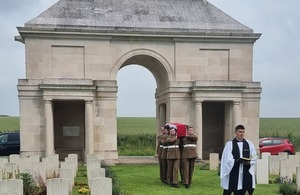 Members of the Royal Anglian Regiment carry the coffin to the graveside at Serre Road No. 2 Cemetery (Crown Copyright)
