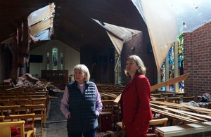 NIO minister Fleur Anderson and Rev Dr Isobel Hawthorne-Steele look inside the Parish Centre which was affected by the recent arson att